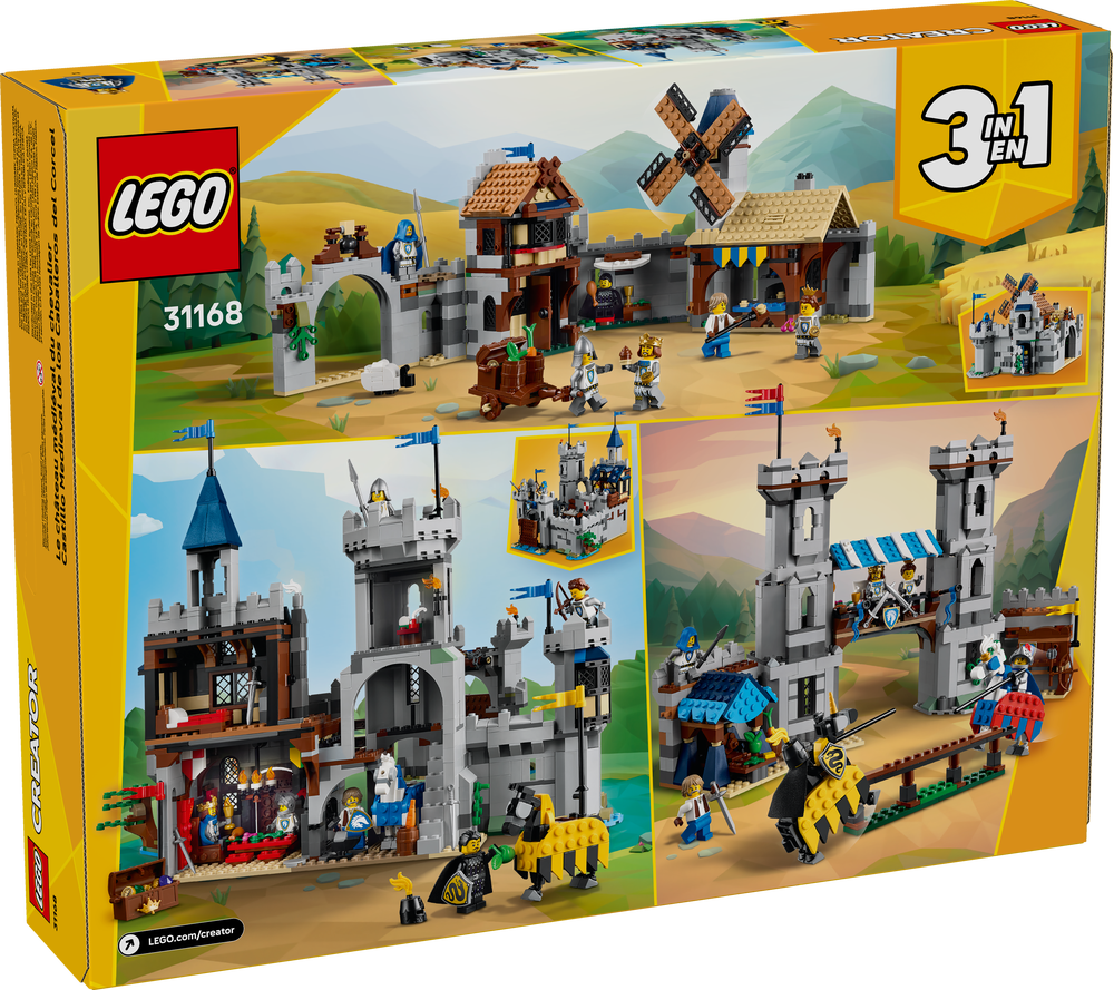 Introduce children to fun medieval action with this LEGO® Creator 3-in-1 Medieval Knight's Castle (31168) building set. The detailed medieval castle opens at the back and is packed with exciting features, including a movable drawbridge, great hall, stable, forge, secret treasure chest, king's chamber, study, and two tower terraces. Boys and girls aged 9 and up can choose from three different building options: an interactive castle playset, a jousting set with a small castle, or a medieval town playset with a windmill. Each playset comes with 6 minifigures: a knight king, champion knight, archer knight, lance knight, blacksmith, and snake knight, plus two posable horses. LEGO Creator 3in1 sets (sold separately) spark children's imaginations with three different play options in each box, so they can build and rebuild with a range of models that appeal to their greatest passions. The models cannot be built simultaneously. The set contains 1,371 pieces.