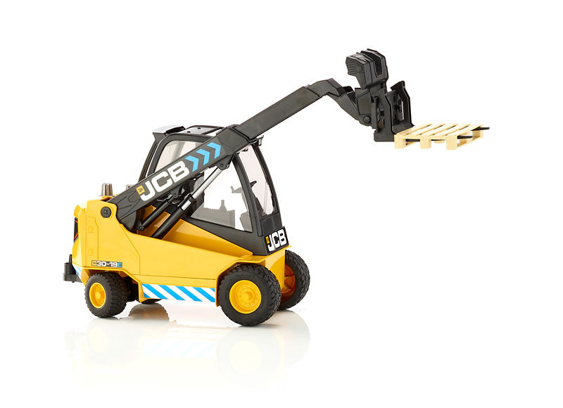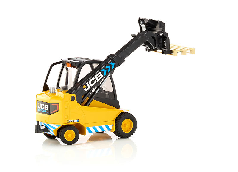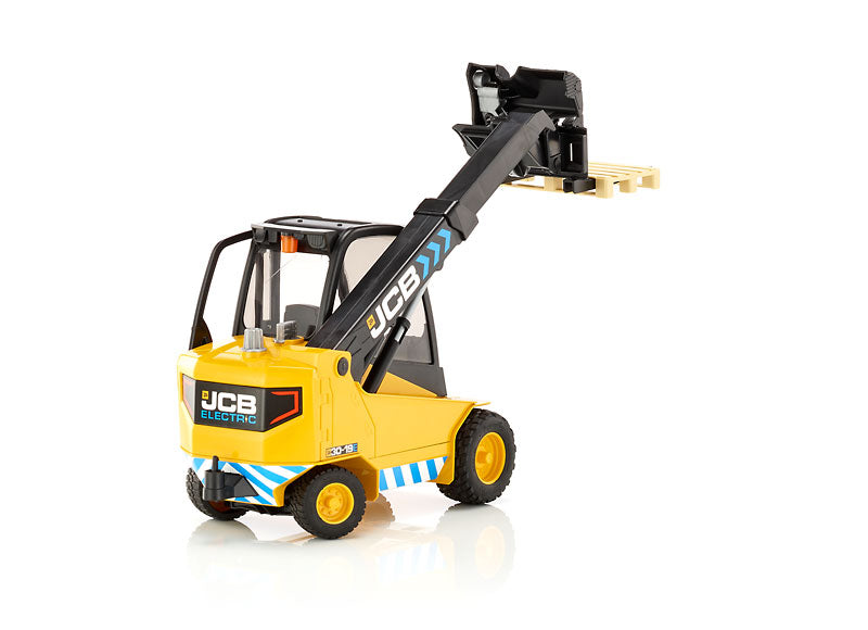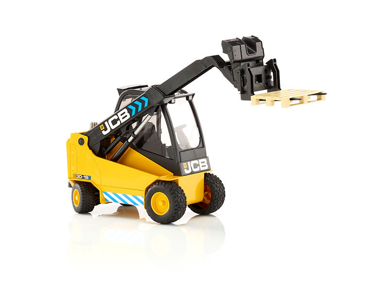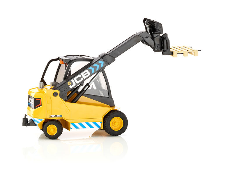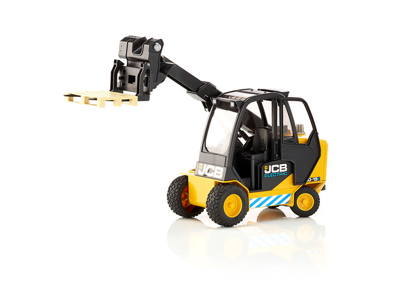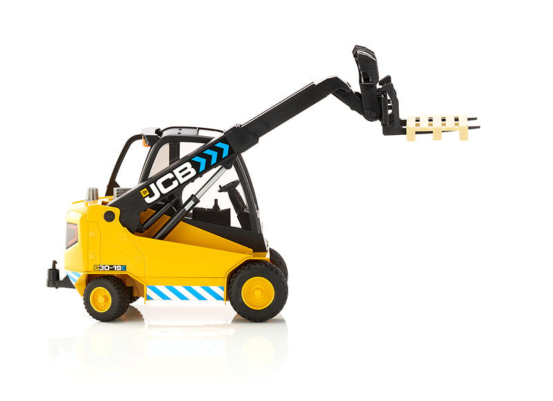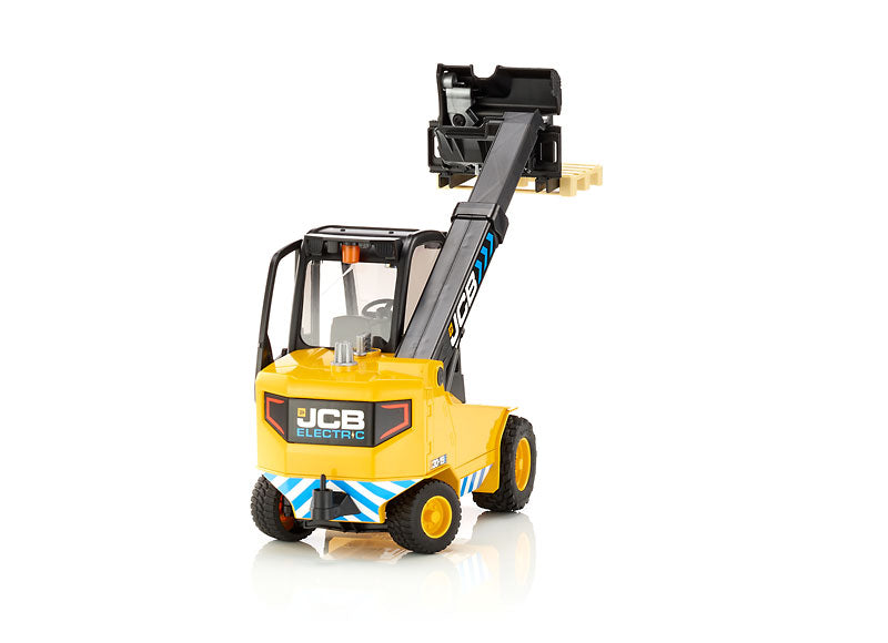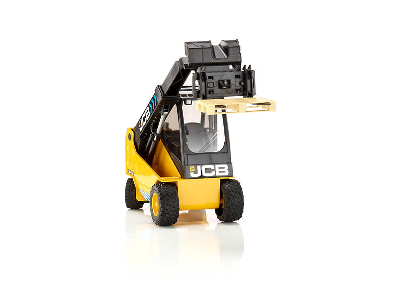 Caractéristiques : • Carrosserie noire et jaune aux couleurs JCB • Cabine vitrée détaillée • Bras télescopique fonctionnel • Fourches mobiles avec palette • Pneus tout-terrain robustes • Bandes de sécurité réfléchissantes • Logo JCB authentique