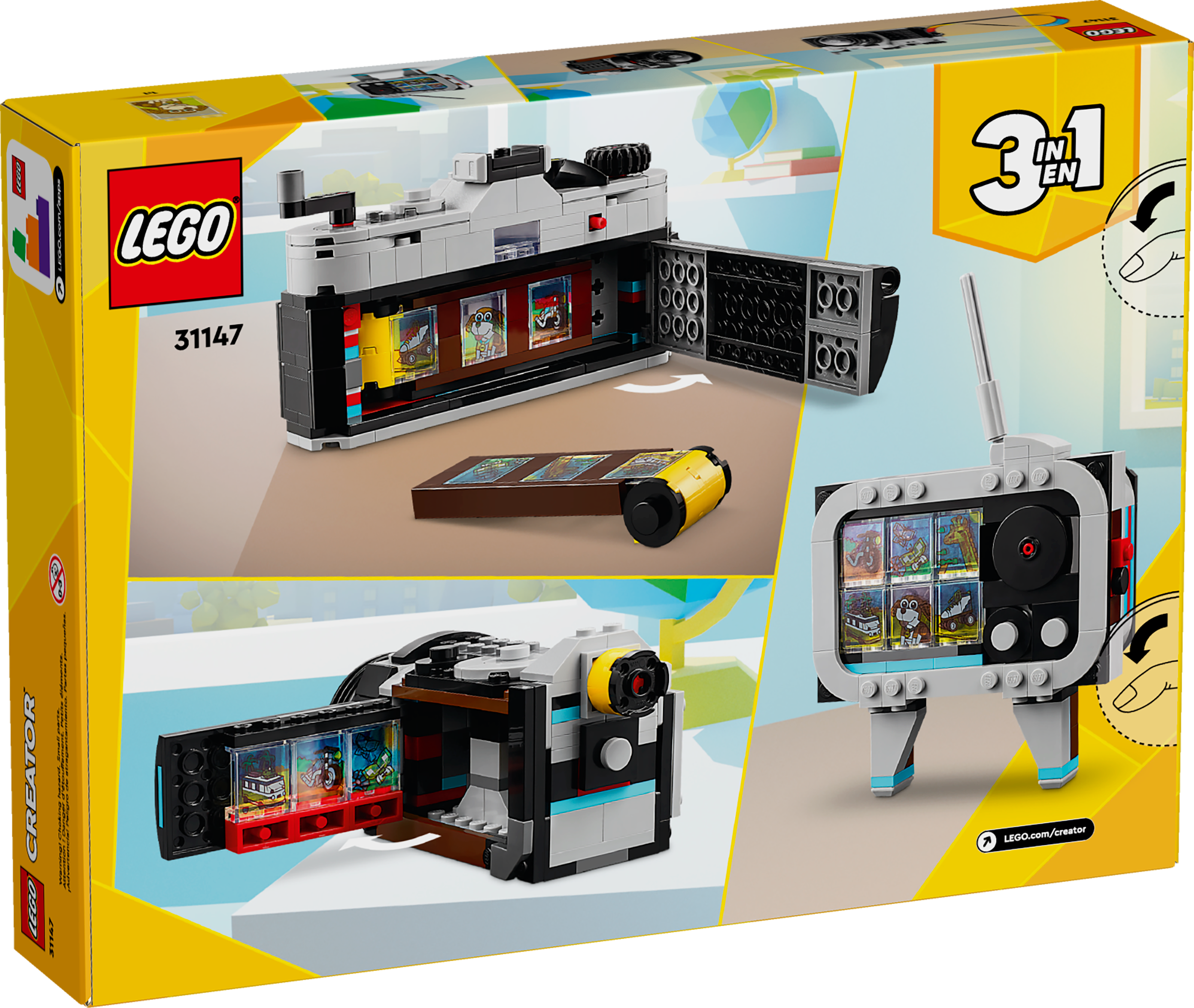 Inspirez le jeu imaginatif avec l’ensemble de construction LEGO® L’appareil photo rétro (31147) 3en1 pour les garçons et les filles âgés de 8 ans et plus. Cet appareil photo emblématique comprend un objectif mobile, des boutons sur le dessus pour prendre une photo, une ouverture à l’arrière pour placer un morceau de film en briques à l’intérieur et une sangle en textile multicolore pour le transporter. Il y a également 6 autocollants que les enfants peuvent ajouter à la pellicule pour représenter leurs photos. Cet ensemble de jouets rétro LEGO® Creator 3en1 permet aux enfants de vivre 3 expériences de construction et de jeu différentes en utilisant les mêmes briques. Ils peuvent construire un appareil photo pour enfants, puis le transformer en caméra vidéo rétro ou en téléviseur rétro avec une antenne. Les trois modèles constituent des objets à exposer que les enfants peuvent placer sur leurs étagères. Avec trois modèles différents à créer dans chaque boîte, les jouets LEGO Creator 3en1 font de superbes cadeaux pour les enfants, qui seront ravis de construire, reconstruire et construire encore. Les ensembles 3en1 leur offrent une gamme de modèles qui font appel à leurs plus grandes passions, notamment des véhicules ultrarapides, des animaux étonnants et des scènes urbaines détaillées.