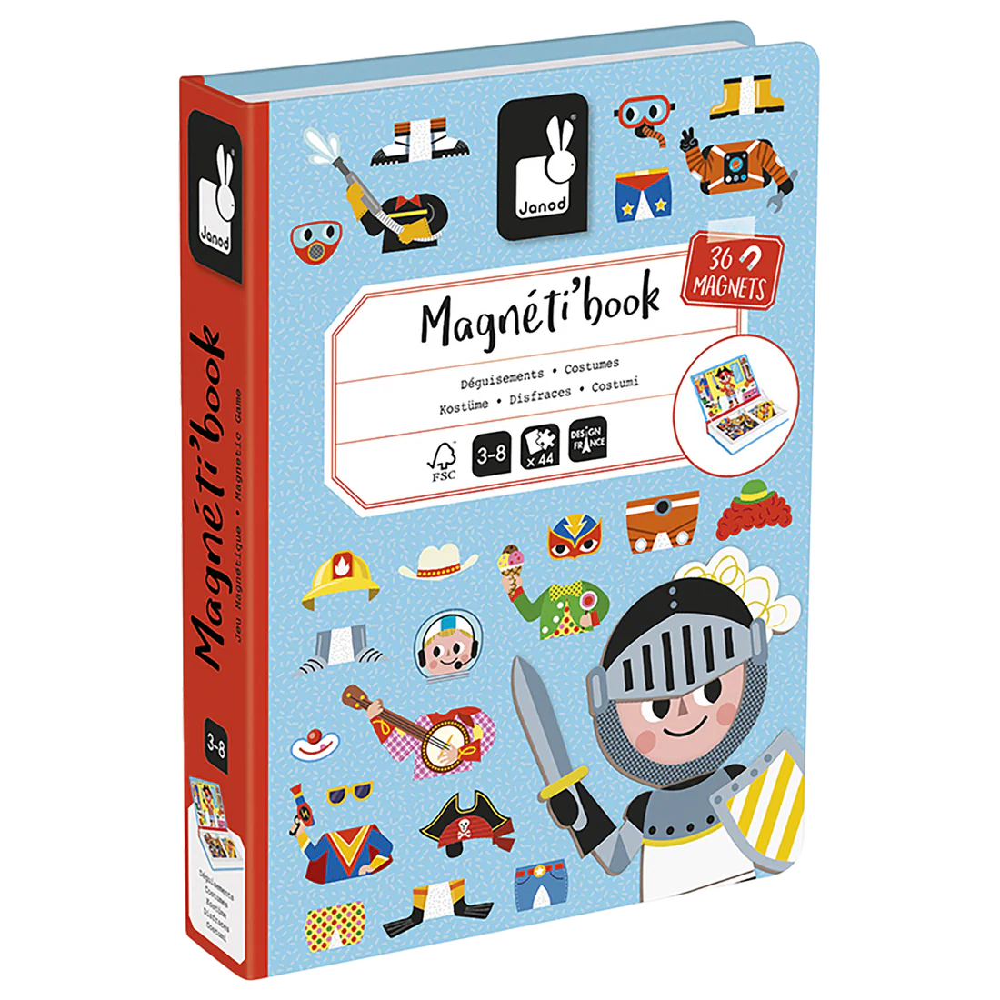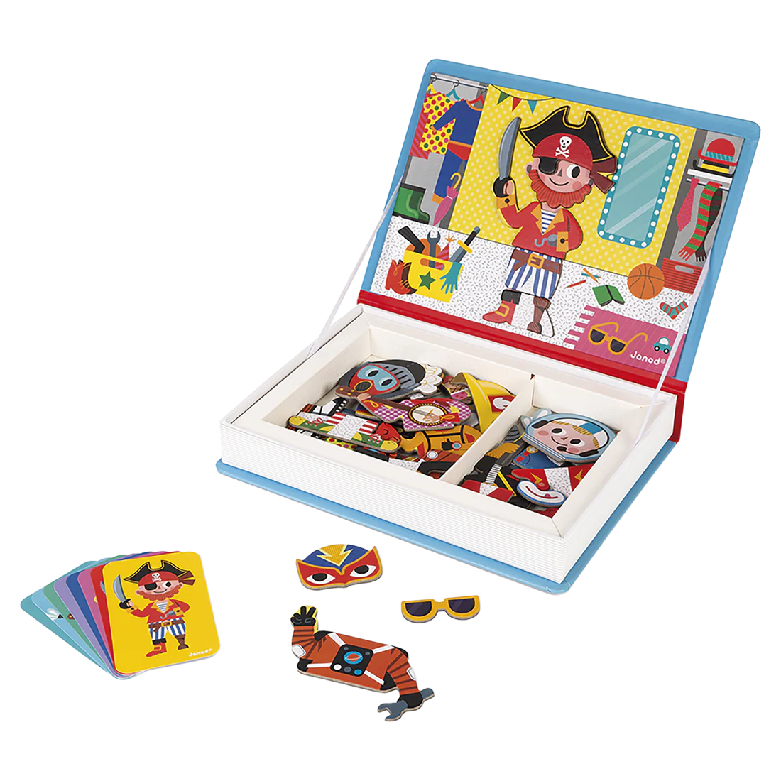Les Magnéti'Book sont des jeux éducatifs malins qui se transportent et se rangent facilement ! Les enfants adorent créer des personnages et s'inventer des histoires. Avec les Magnéti'Book ça devient facile ! Les magnéti'book sont parfaits pour les longs trajets en voitures ou les attentes qui se prolongent. Ce jeu éducatif magnétique en carton sur le thème des déguisements de garçons est composé de 36 magnets et de 8 cartes. Une fois le livre ouvert, le but du jeu est de recomposer sur la scène le déguisement indiqué sur la carte à l'aide des magnets ou de créer ses propres déguisements ! Pratique, ce jeu se transporte facilement et peut être emmené partout !
